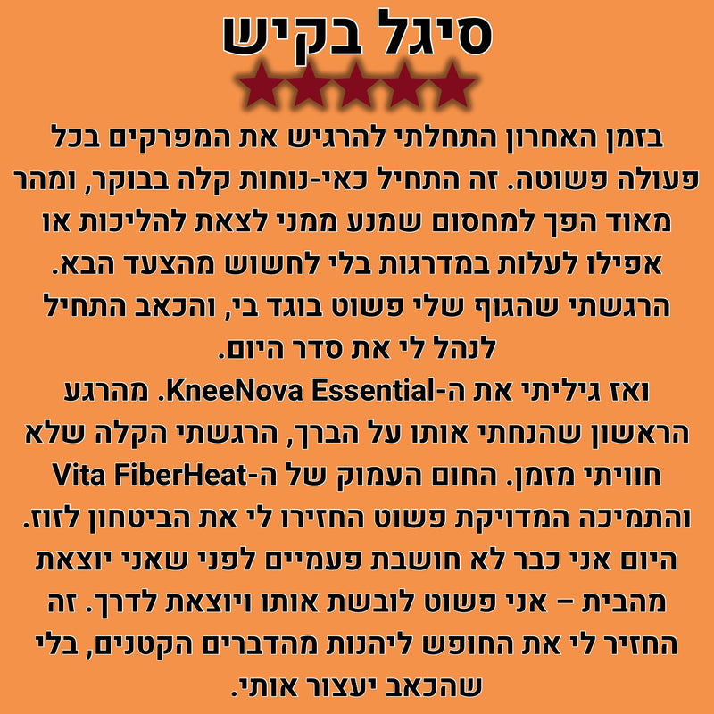 הכאב הוא המחסום שמונע ממך לעלות במדרגות בביטחון או ליהנות מטיול משפחתי. ה-KneeNova Essential הוא השותף השקט שלך לניצחונות הקטנים: מהרגע שתלבש אותו, העומס יתפזר והביטחון יחזור לכל צעד.