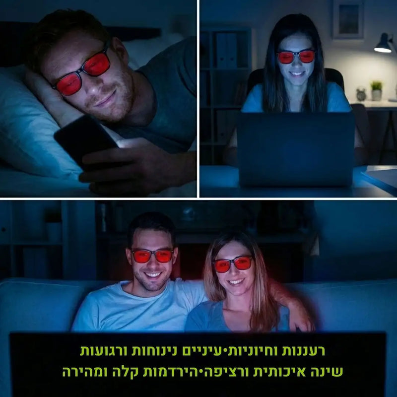 שימוש במשקפיים בשעתיים שלפני השינה מאותת למוח שהגיע זמן לנוח. זה מאפשר הפרשה טבעית של מלטונין ("הורמון השינה"), מה שמבטיח הירדמות קלה יותר ואיכות שינה גבוהה פי כמה.